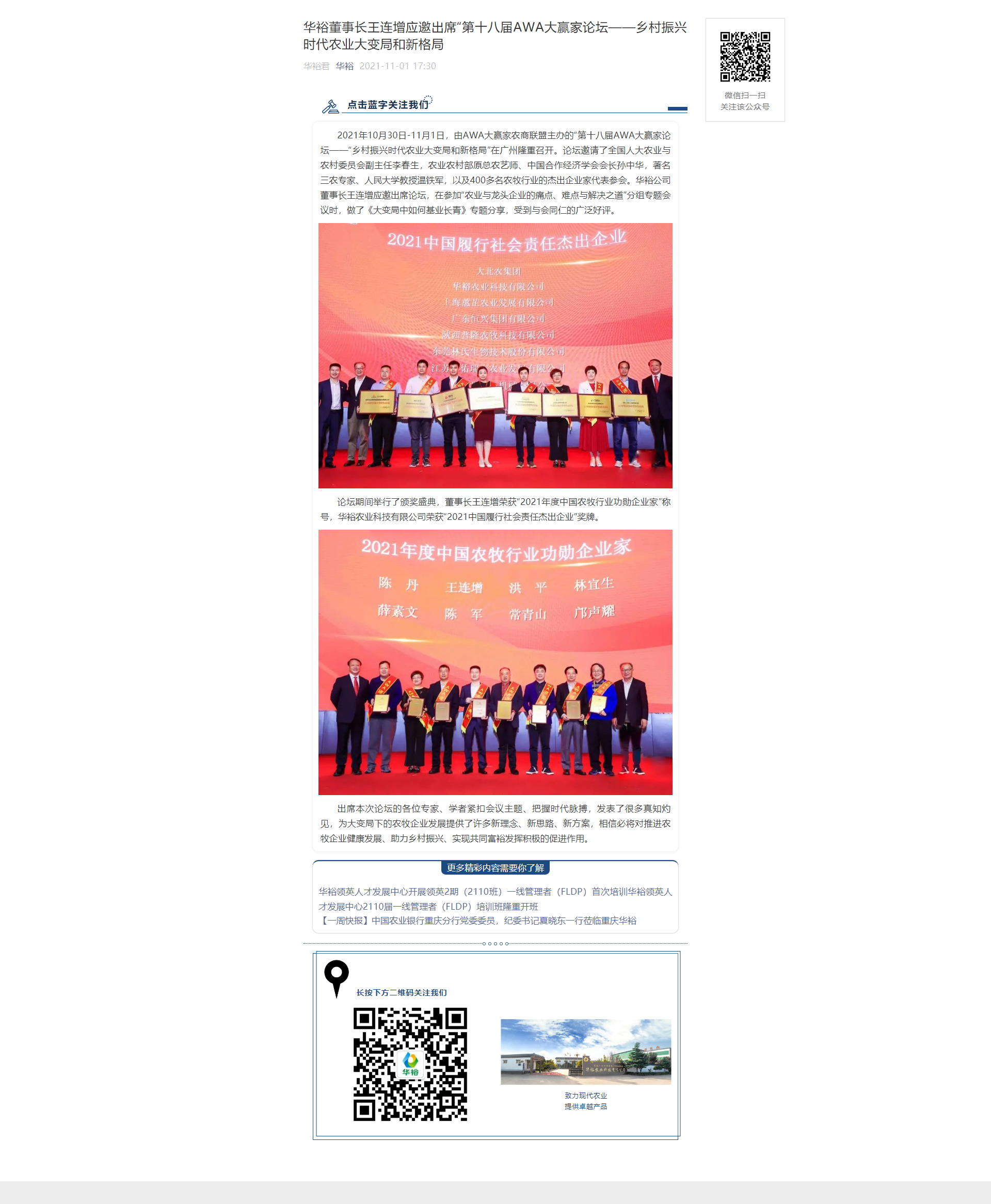 华裕董事长王连增应邀出席“第十八届AWA大赢家论坛——乡村振兴时代农业大变局和新格局