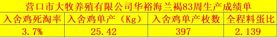 *83周入舍鸡累积只鸡产蛋总重较海兰标准高2.12公斤;