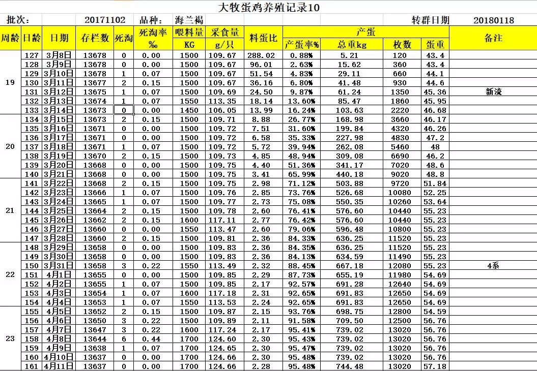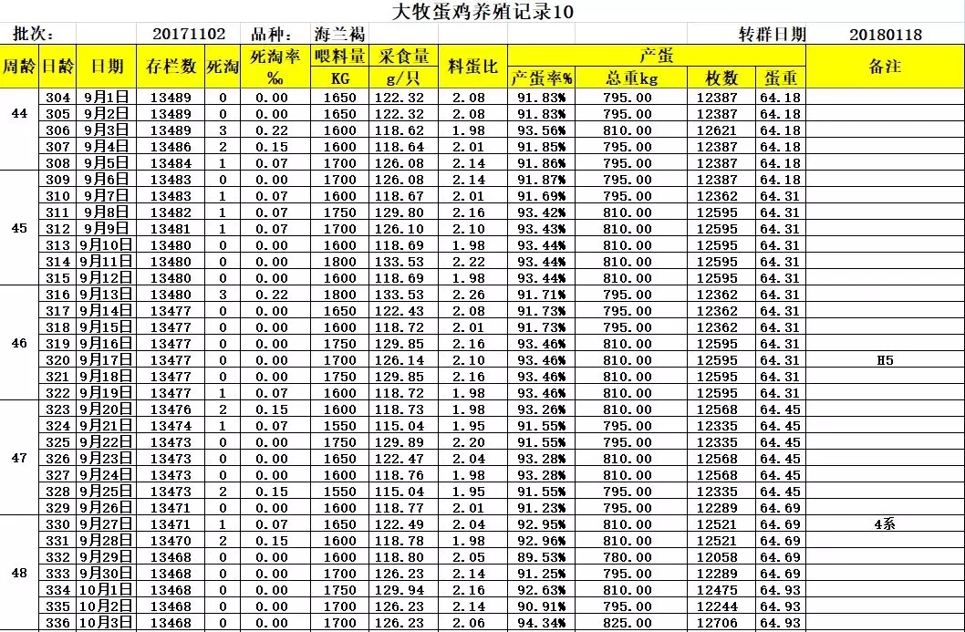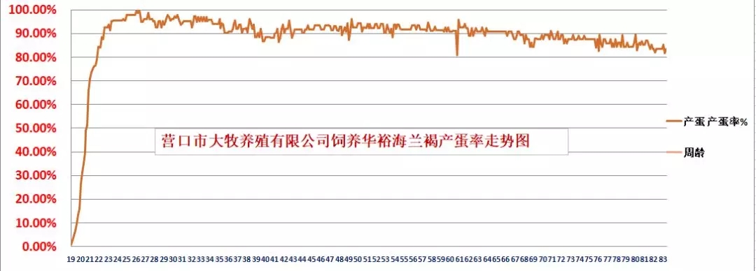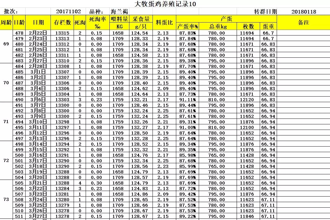 从2017年11月2日开始,大牧养殖有限公司引进华裕海兰褐雏鸡41800羽,转群后分为3栋,(本文统计数据截止到2019年6月5日鸡群83周龄末,581日龄。)以下为其中一栋生产数据,下面就把大牧禽业的生产数据给大家做个分享:
