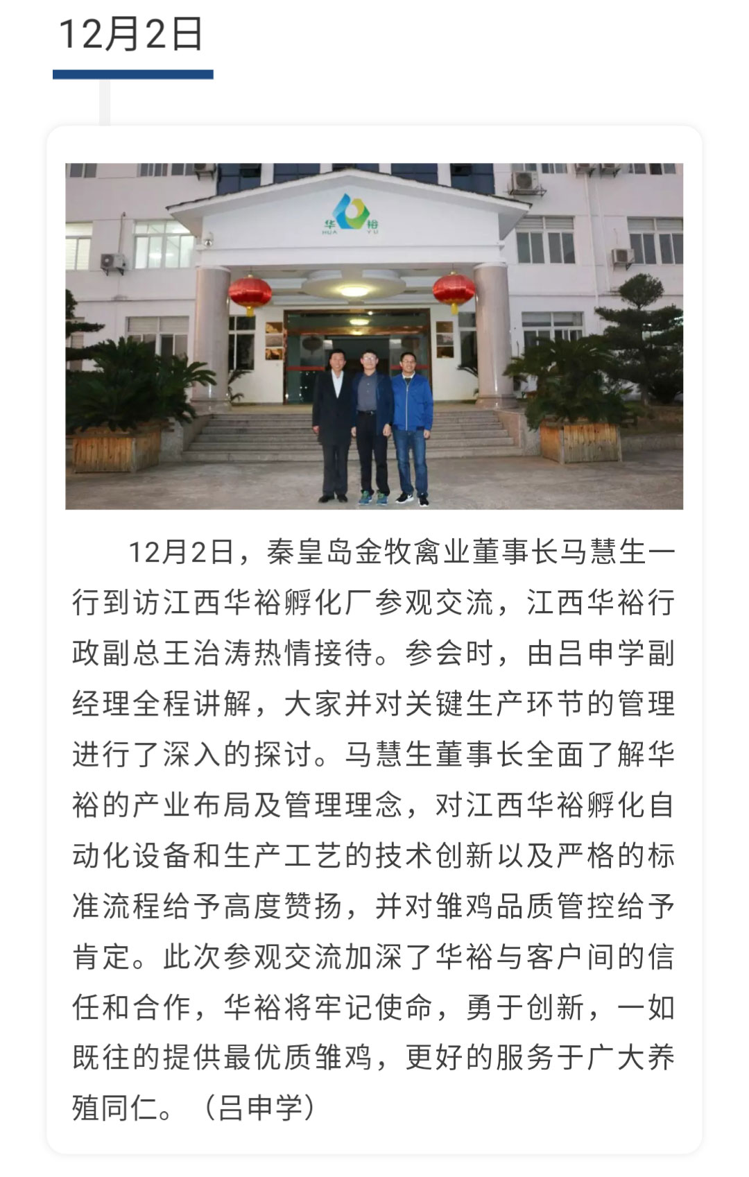 【一周快报】秦皇岛金牧禽业董事长马慧生到访江西华裕