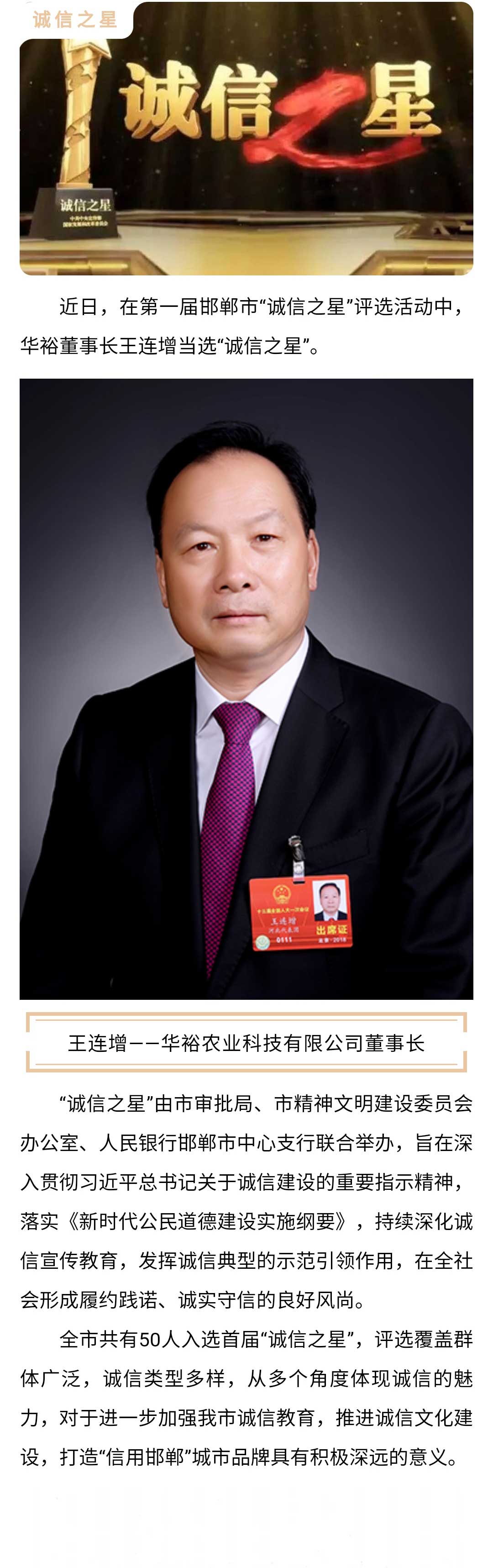 喜讯!华裕董事长王连增当选邯郸市首届“诚信之星”
