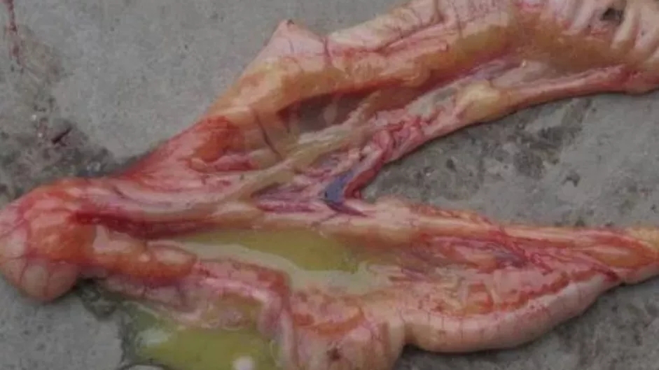 剖检可见肠道扩张,肠内充满液体、气体,肠壁变薄,肠粘膜脱落,肝脏颜色变浅,有时表面有坏死灶,肾脏肿大、萎缩,颜色苍白或有白色尿酸盐沉积。